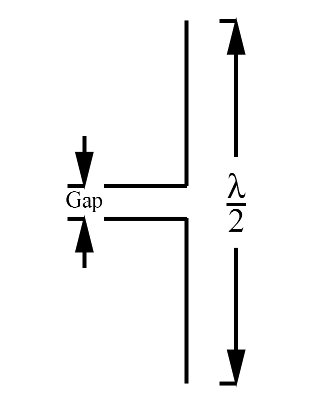 . Likewise, because a finite gap must exist between the two antenna elements (and this gap is not accounted for within Equation: 8) some modifications to the length equation must be made to account for this gap. Conversely, since the gap shown (within Figure: 1) extends outwards from the center of the antenna symmetrically, the gap must also be divided by two in order to obtain the size (or half gap) that each antenna element needs to have subtracted from its element length in order to maintain the antenna's overall half-wavelength, as shown by: